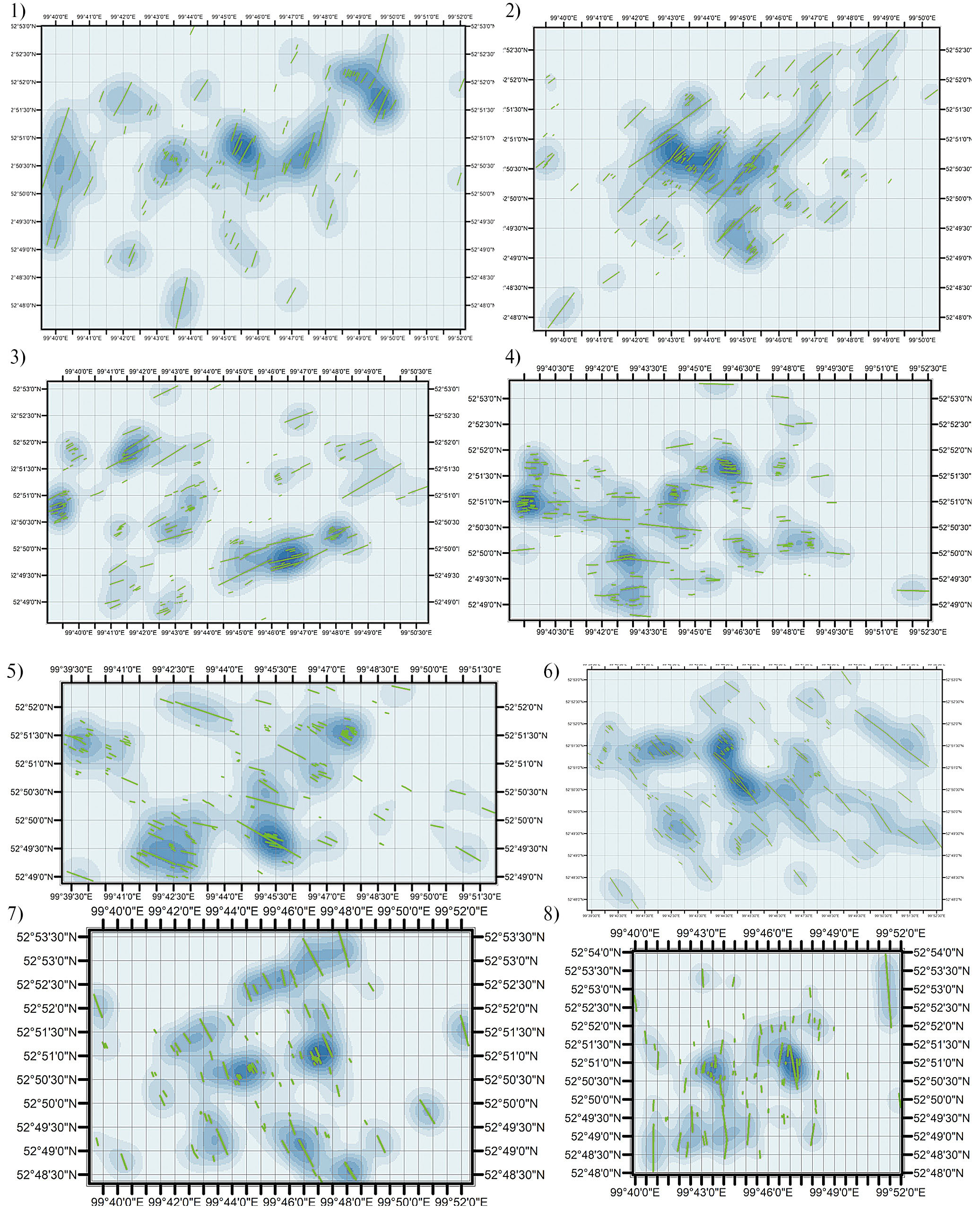 Рис. 5. Линеаменты на картах плотности восьми различных ориентировок: 1) 22.5° ± 11.25°, 2) 45° ± 11.25°, 3) 67.5° ± 11.25°, 4) 90° ± 11.25°, 5) 112.5° ± 11.25°, 6) 135° ± 11.25°, 7) 157.5° ± 11.25° и 8) 180° ± 11.25°. Зеленым показаны соответствующие ориентировки.