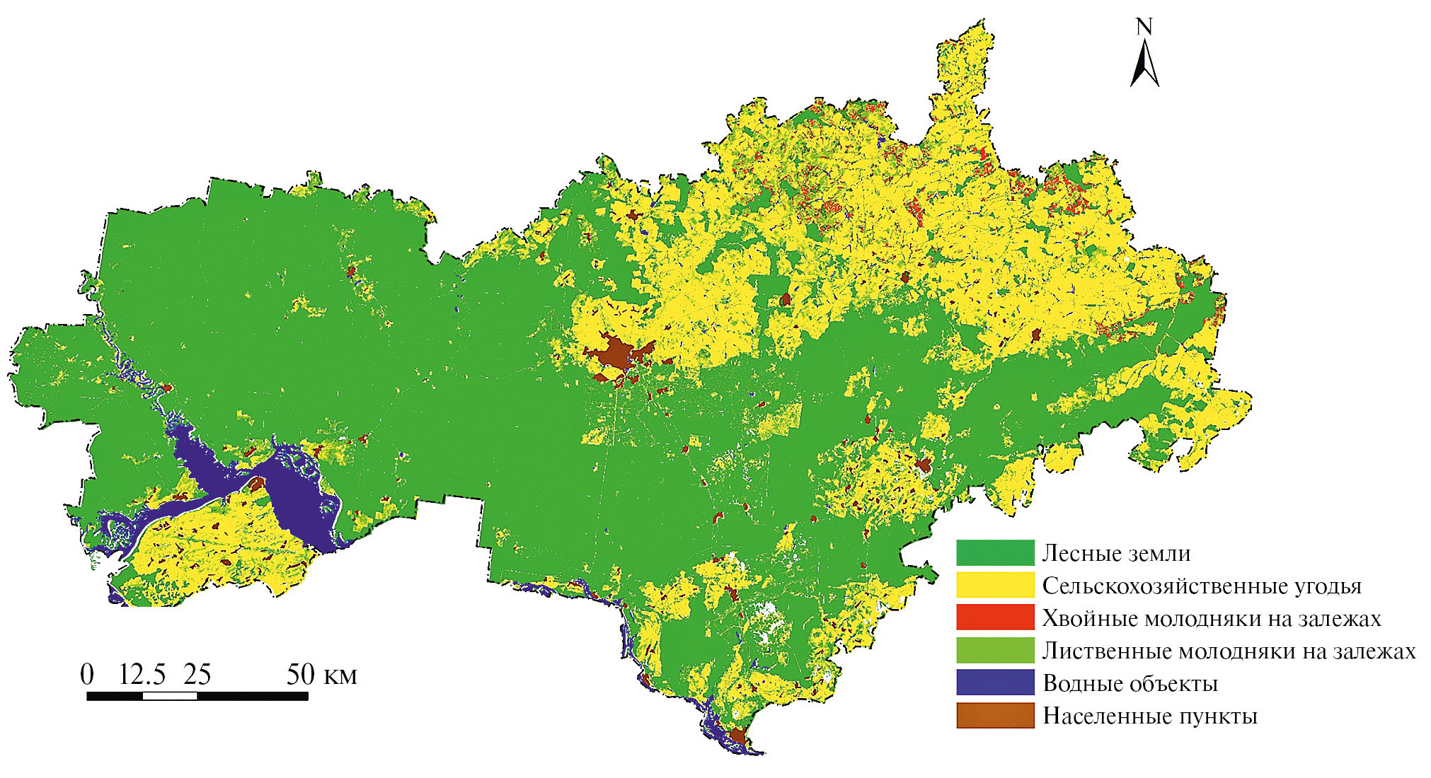 Рис. 3. Картосхема Республики Марий Эл за 2022 г. с выделенными участками молодых хвойных и лиственных пород на залежах.