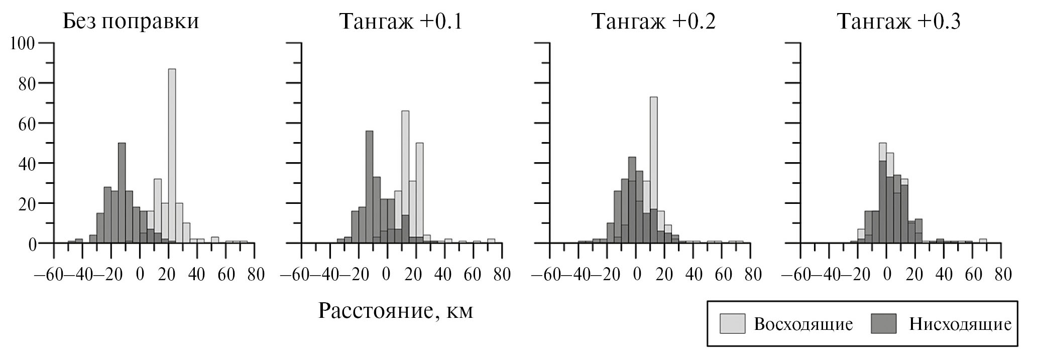 Рис. 7. Гистограммы расстояния между найденной и точной береговой линией для четырех вариантов ручной коррекции угла тангажа.