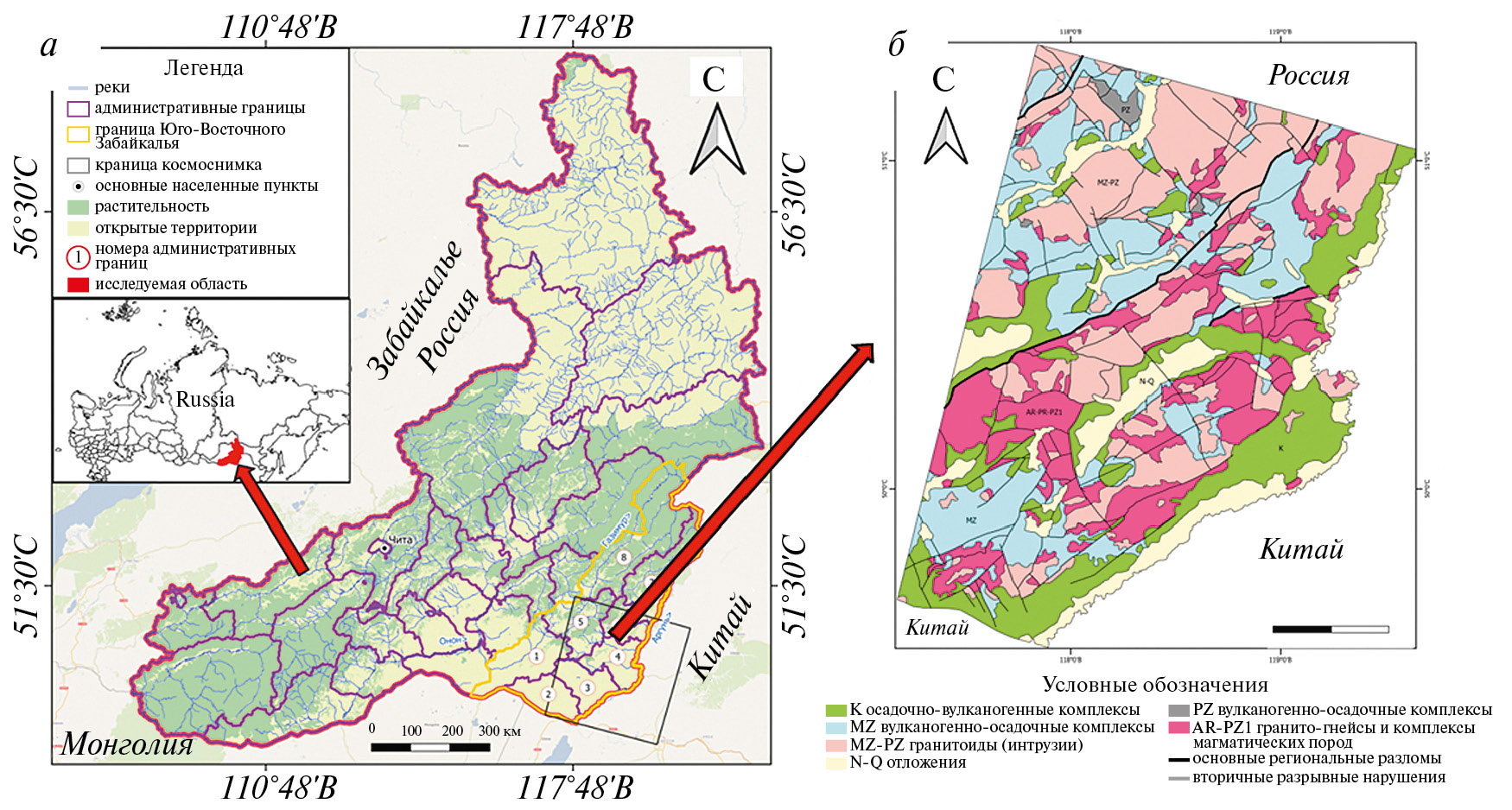 Исследуемая территория располагается в юговосточной части Забайкальского края (Россия) и географически простирается с запада на восток между долинами рек Онон и Аргунь, а с севера на юг между долиной реки Газимур и государственными границами страны с Китаем и Монголией (рис. 1а).
