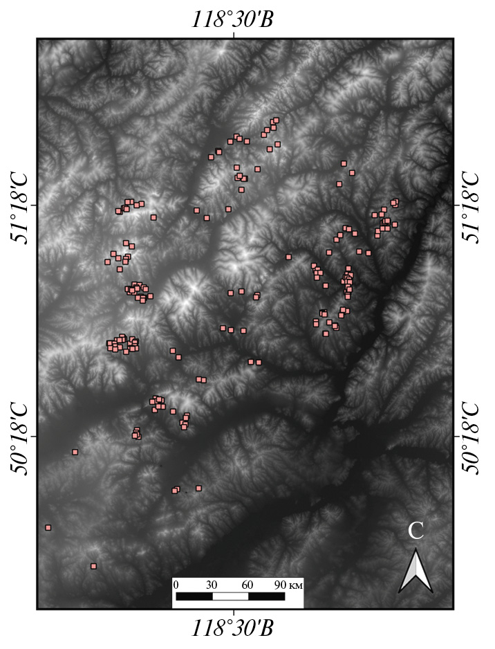 4. Fig. 3. Visualization of the digital elevation model of the study area based on SRTM. Known polymetallic ore objects are highlighted with pink dots.