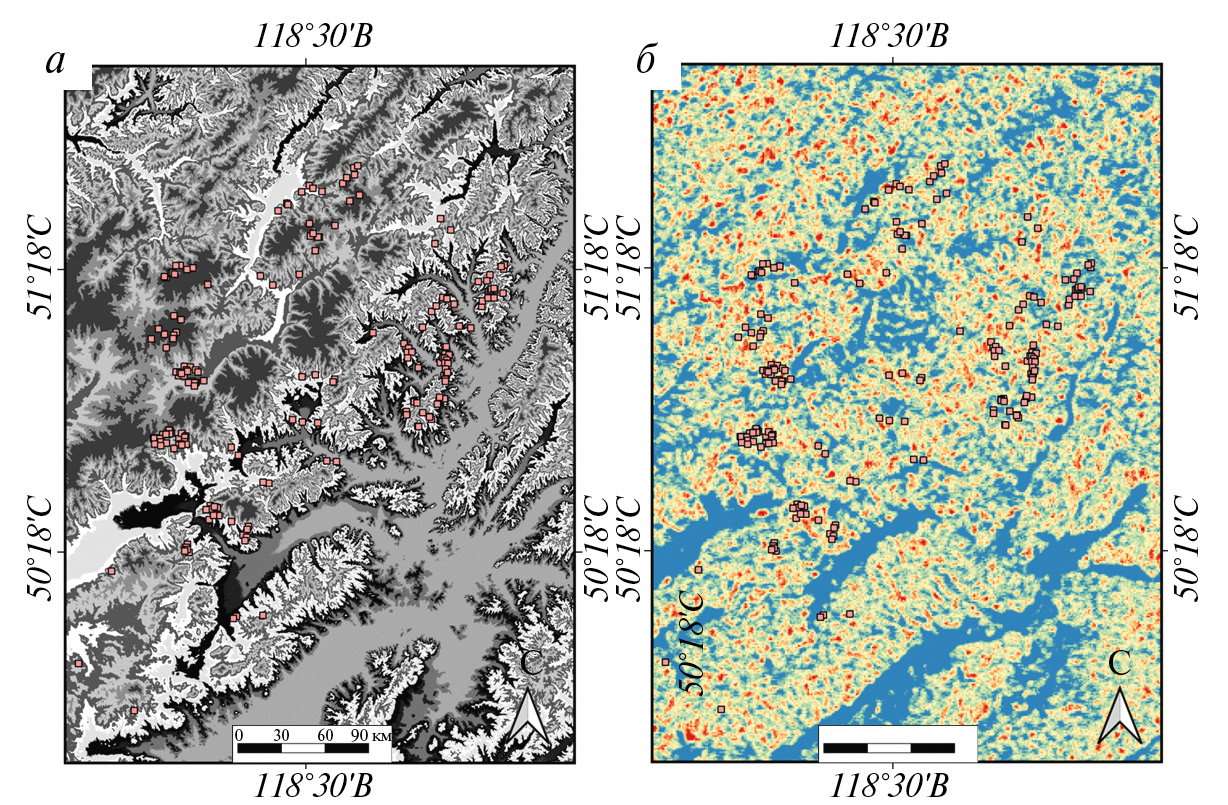 Рис. 4. Критерии, выделенные на основе ЦМР: а – уровни эрозионного среза, б – карта плотностей линеаментов. Розовыми точками отмечены известные полиметаллические рудные объекты.