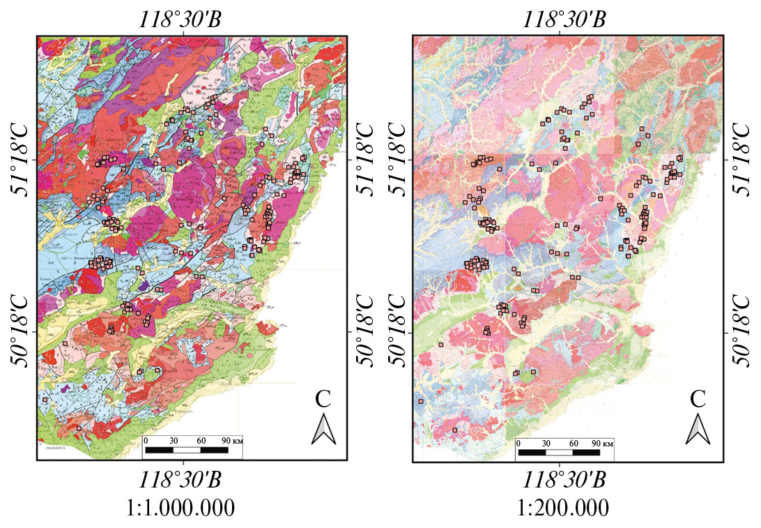 6. Fig. 5. Geological map at a scale of 1:1,000,000 and a complex of geological maps at a scale of 1:200,000. Known polymetallic ore objects are highlighted with pink dots.