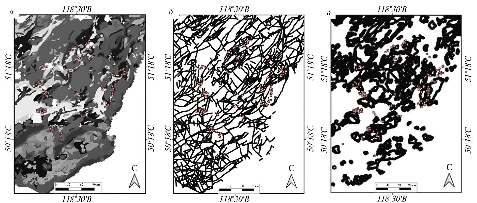 Рис. 6. Критерии, выделенные на основе ГГК: а – литология, б – разломная тектоника, в – зоны контактов интрузивных тел. Розовыми точками выделены известные полиметаллические рудные объекты.