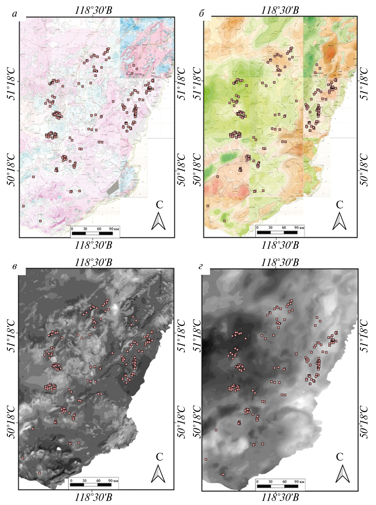 Рис. 7. Геофизические данные: а ‒ комплекс схем аномалий магнитного поля (1:200.000) (М-IV, V, VI, X, XI, XII, XVI, XVII, XVIII, XXII, XXIII), б ‒ комплекс схем аномалий гравитационного поля (1:200.000) (М-IV, V, VI, X, XI, XII, XVI, XVII, XVIII, XXII, XXIII), в ‒ схема аномалий магнитного поля (оцифрованная), г ‒ схема аномалий гравитационного поля (оцифрованная). Розовыми точками выделены известные полиметаллические рудные объекты.
