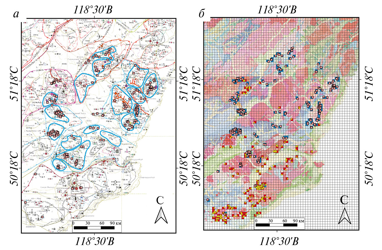 Рис. 8. Критерии, выделенные на основе карты полезных ископаемых: а ‒ карта рудных узлов, б ‒ схема распределения рудных объектов (треугольниками выделены рудные объекты Fl, Mn, Mo, Sn, U и W; квадратами – Zn и Pb; синим цветом – положительные области; красным – отрицательные). Розовыми точками выделены известные полиметаллические рудные объекты.
