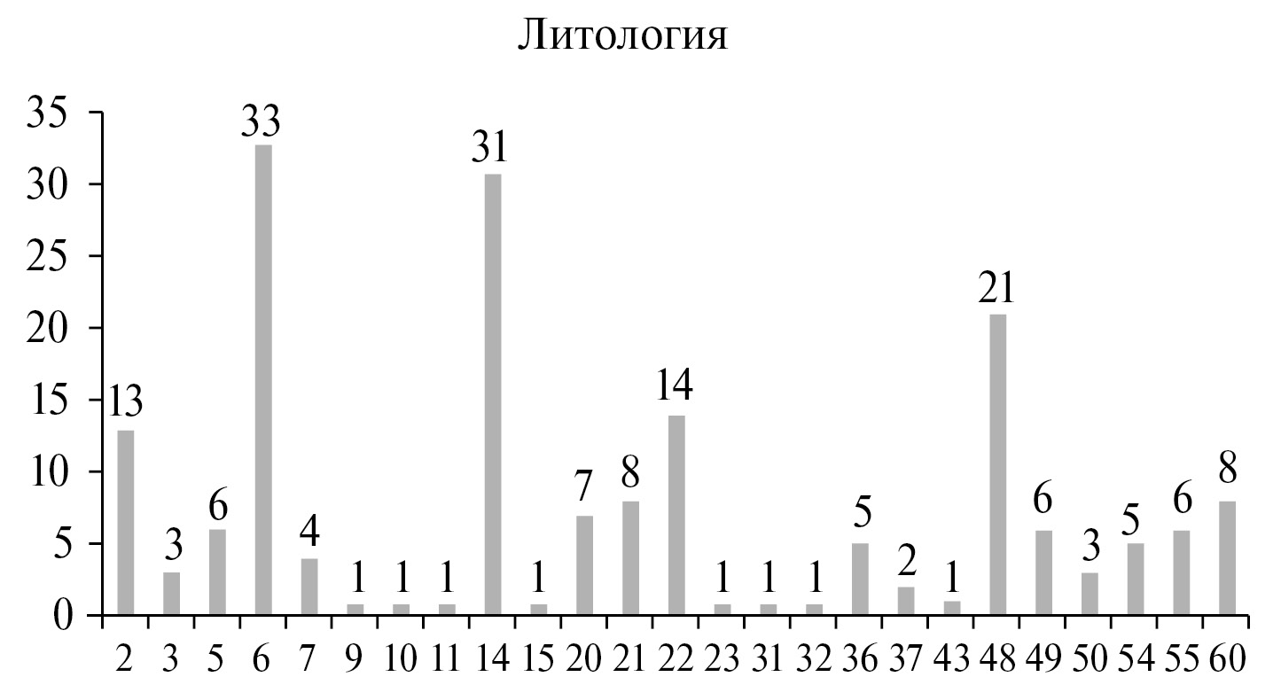 Рис. 9. Гистограмма принадлежности полиметаллических рудных объектов к литологическим разностям, т.е. классам, представленным на гистограмме.