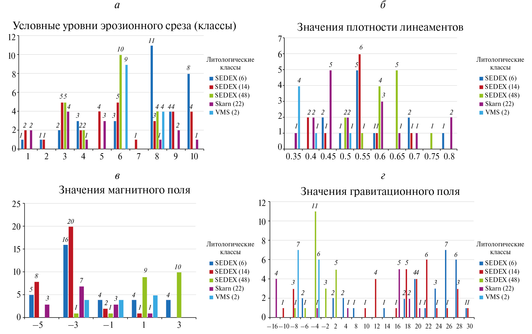 11. Fig. 10. Histograms of the belonging of the established productive lithological classes to: a ‒ conventional levels of erosion cut, b ‒ lineament density values, c ‒ magnetic field values, d ‒ gravitational field values.