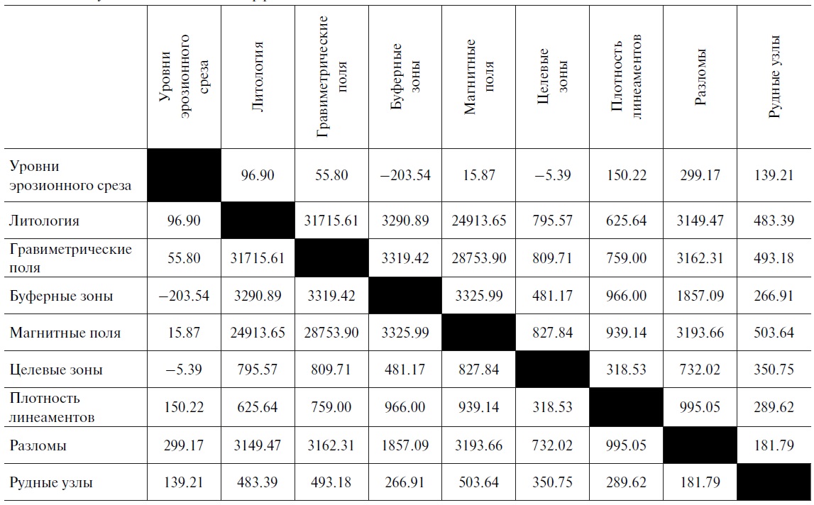 Как можно заметить, очень сильную корреляцию демонстрируют геофизические данные и литологический состав горных пород. Также наблюдается слабая корреляция у буферных зон и разломов. Остальные данные имеют очень слабую корреляцию.