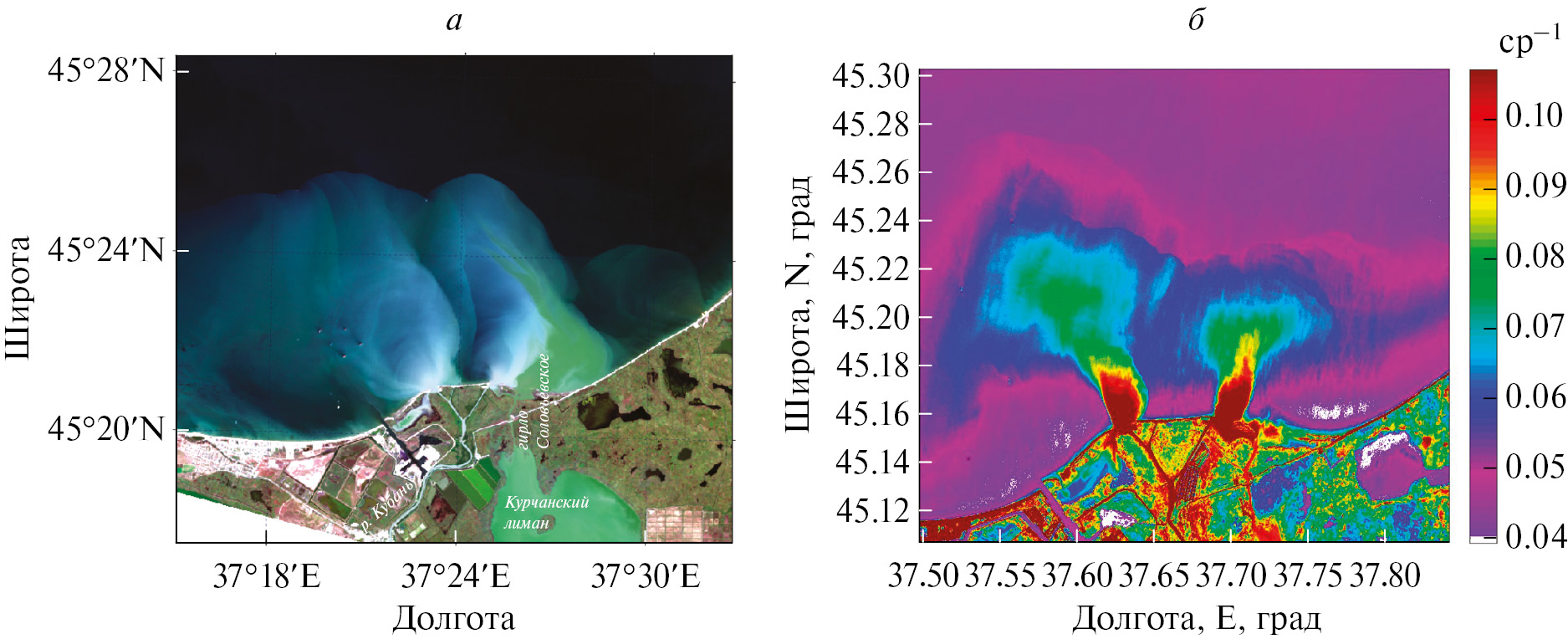 На спутниковых изображениях в естественных цветах (RGB-композит) плюм имеет более высокие значения коэффициента яркости и может выделяться как зона коричневых, зеленоватых, желтоватых цветах (рис. 1, а). Как правило, плюм основного рукава Кубани формируется в виде двух основных струй. Кроме того, вблизи устья Кубани в отдельных случаях формируется выраженный плюм вод мелководного Курчанского лимана (глубина до 1,5 м), питание которого также происходит за счет Кубанских вод (Гарькуша и др., 2022).