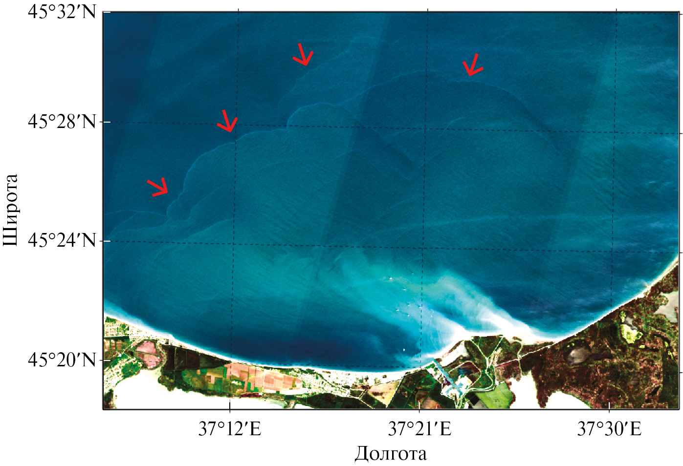 Попадая в Темрюкский залив, на границе пресных речных вод формируются зоны конвергенции, которые фиксируются на спутниковых изображениях и выглядят как тонкие полосы на поверхности моря с более высокими значениями сигнала. Такая ситуация показана на примере спутникового снимка OLI Landsat 8 от 16.05.2019 г. (рис. 2), где предполагаемая зона конвергенции находится на некотором отдалении от устья и непосредственно плюма (выделена красными стрелками).