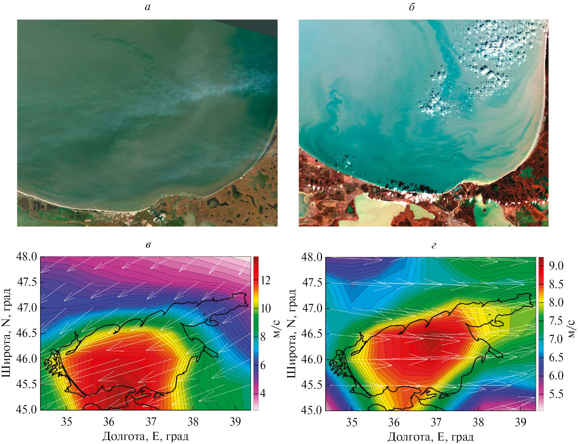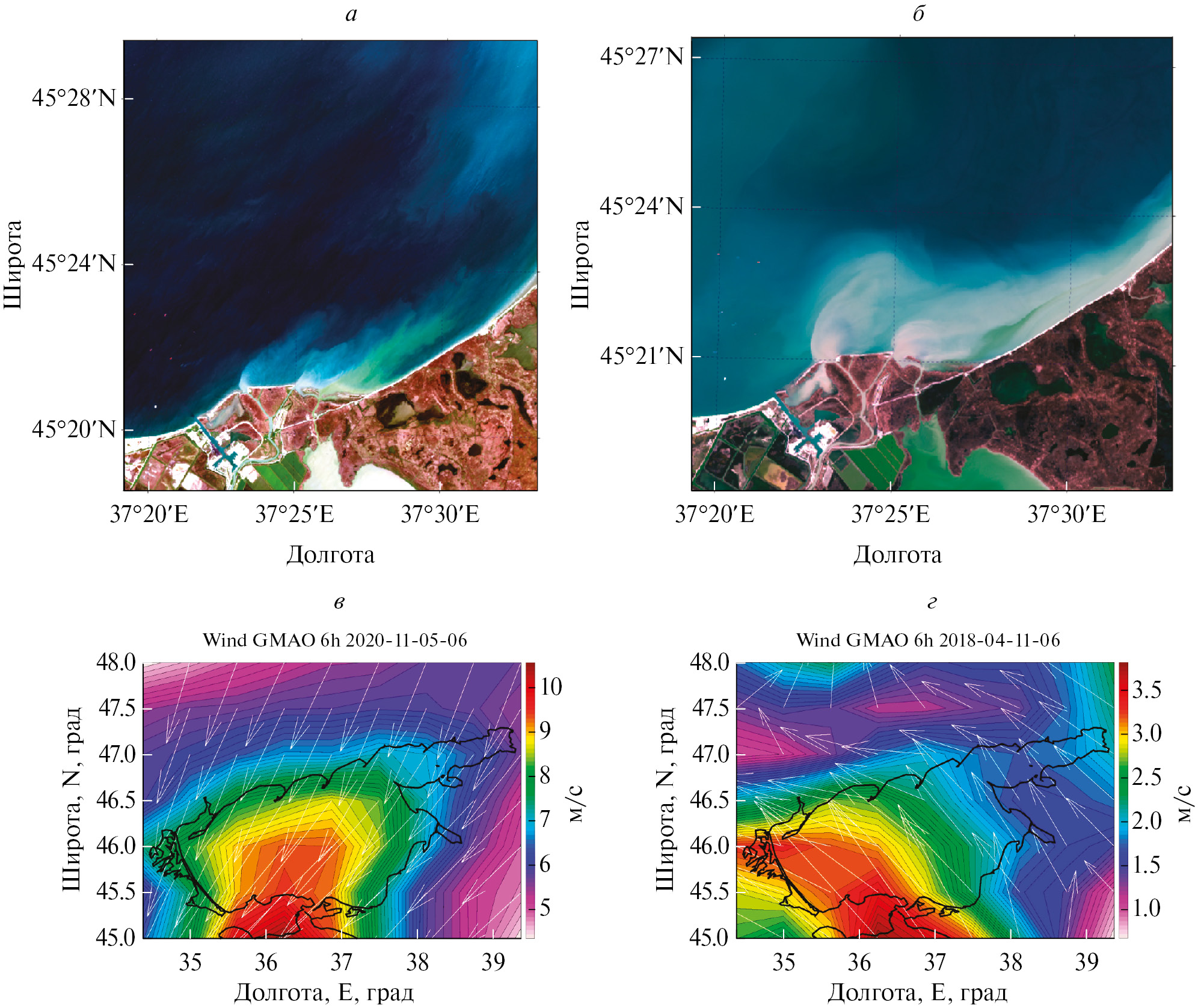 При некоторых гидрометеорологических условиях идентифицировать плюм Кубани по оптическим спутниковым данным невозможно или затруднительно. В первую очередь это может быть связано с обширным облачным покровом над районом исследования. Во-вторых, при интенсивном ветровом воздействии происходит перемешивание вод до дна, что приводит к взмучиванию донных осадков и росту мутности вод. В результате, речной плюм будет либо также подвержен интенсивному перемешиванию с окружающими водами, либо не будет выделяться относительно взмученных вод акватории. Примеры такого интенсивного ветрового взмучивания показаны на спутниковых изображениях Landsat 8 от 13.10.2018 г. и Sentinel-2 от 13.02.2020 г. (рис. 3, а, б). В случае от 13.10.2018 г. (рис. 3, а) над исследуемым районом наблюдался интенсивный северо-восточный ветер со скоростью более 10 м/с (рис. 3, в) длительностью около суток, что привело к сильному взмучиванию вод Темрюкского залива. Аналогичная ситуация наблюдается и в случае от 13.02.2020 г. (рис. 3, б), когда на спутниковом снимке плюм речных вод также не идентифицируется при сильном перемешивании вод из-за длительного (более 2 суток) воздействия ветра со скоростью более 8 м/с (рис. 3, г).