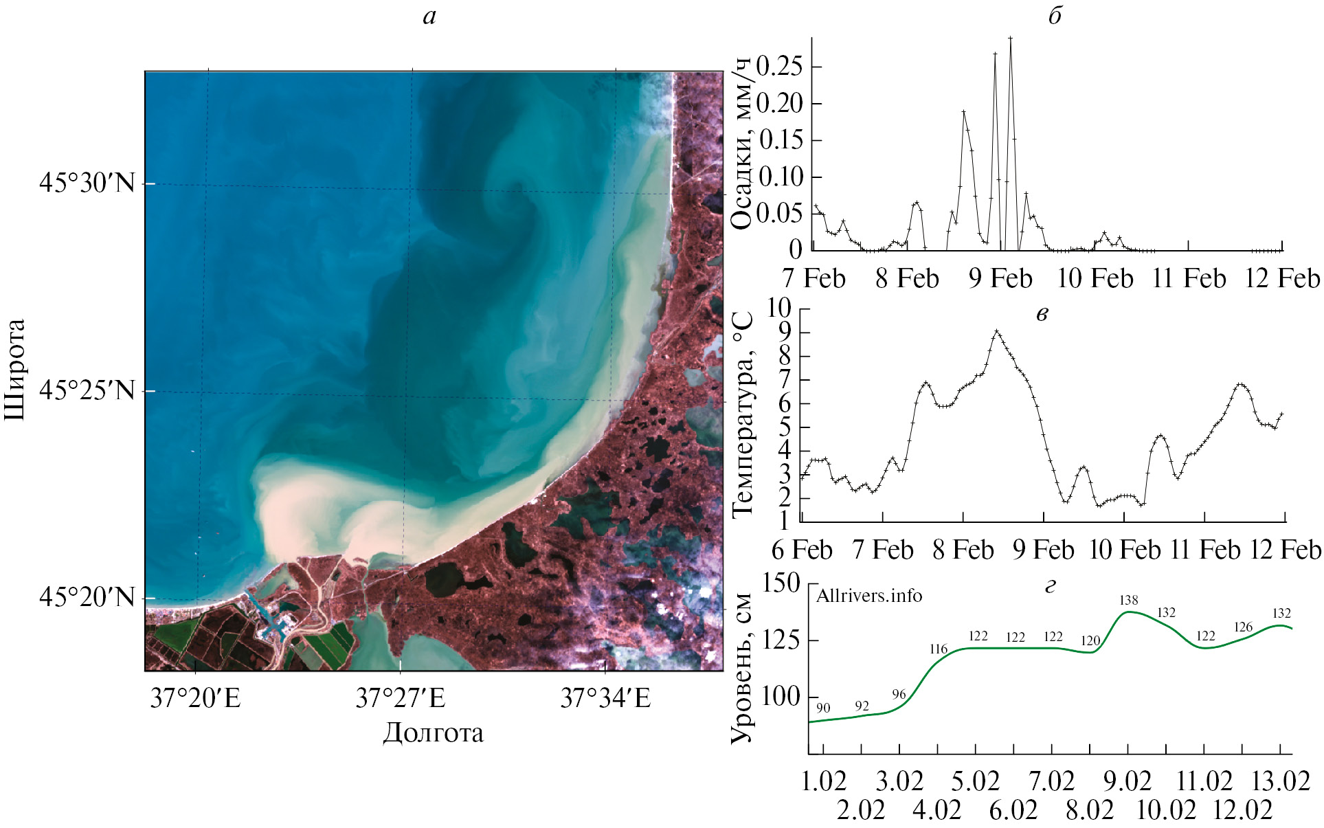 В связи с этим, гидрометеорологические условия рассматривались только для зоны нижнего течения реки Кубань (после Краснодарского водохранилища). Так, на рис. 4, а показан пример интенсивного плюма Кубани, наблюдаемый на спутниковом изображении OLI Landsat 8 от 10.02.2022 г. после увеличения осадков над исследуемым регионом. Интенсивный поток мутных речных вод, резко отличающихся по оптическим характеристикам от окружающих морских вод, направлен на восток от устья и распространяется вдоль береговой линии Темрюкского залива. На графике изменчивости количества осадков по данным MERRA-2 Model (рис. 4, б) видно, что предварительно 08-09.02.2022 г. наблюдается резкое увеличение осадков до 0,3 мм/час. При этом 07.02 отмечается резкое повышение температуры воздуха до 9°С 08.02 (рис. 4, в), что в совокупности с дождевыми осадками привело к резкому сокращению снежного покрова в районе нижнего течения р. Кубань. В результате в этот период на гидропосту в г. Темрюк (рис. 4, г) регистрируется увеличение уровня воды в реке с 120 см (на 08.02) до 138 см (09.02).
