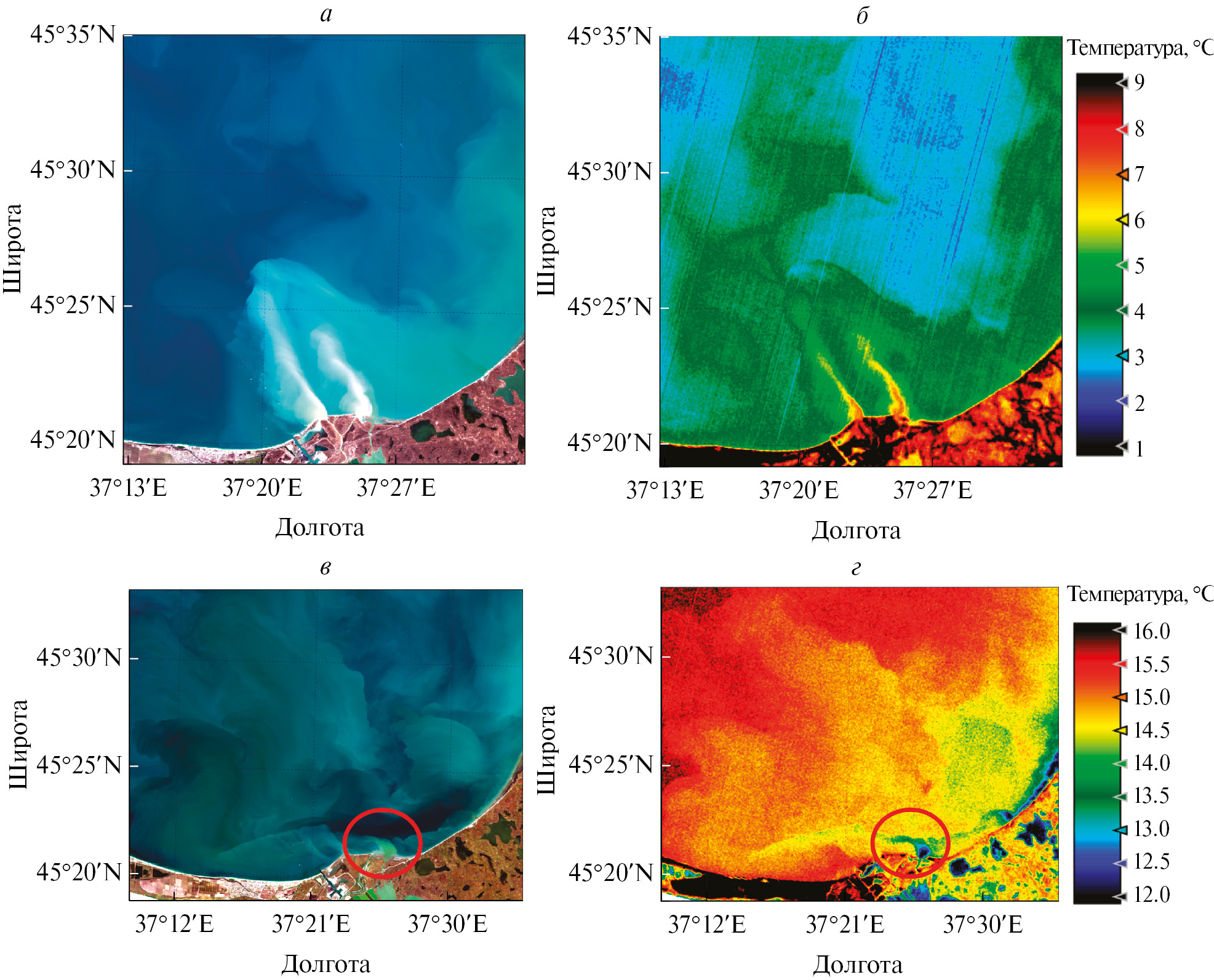 Рис. 5. Проявление плюма Кубани по данным Landsat 8. а – RGB-композит в натуральных цветах от 28.02.2017 г.; б – поле температуры поверхностного слоя моря от 28.02.2017 г.; в – RGB-композит в натуральных цветах от 19.10.2023 г.; г – поле температуры поверхностного слоя моря от 19.10.2023 г.