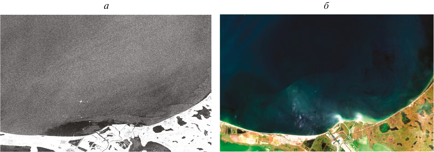 На радиолокационных изображениях в приустьевом районе часто могут наблюдаться зоны со сглаженной шероховатостью поверхности моря, визуально представляющие собой более темные пятна относительно окружающей морской поверхности (рис. 6, а). Вероятно, такое изменение шероховатости поверхности связано с поступлением вместе с речными водами поверхностно-активных веществ. При этом такие зоны не всегда совпадают с конфигурацией плюма на оптических спутниковых изображениях, полученных с некоторым временным интервалом (рис. 6, б), что может говорить также о влиянии других факторов, например, формированию зоны ветровой тени вблизи данного участка побережья или объясняться разностью по времени между снимками, за которую конфигурация могла измениться. Типичные скорости движения фронта плюма 0,25–0,35 м/с (оцениваемые по последовательным снимкам) не противоречат наблюдаемым на представленных снимках смещениям.