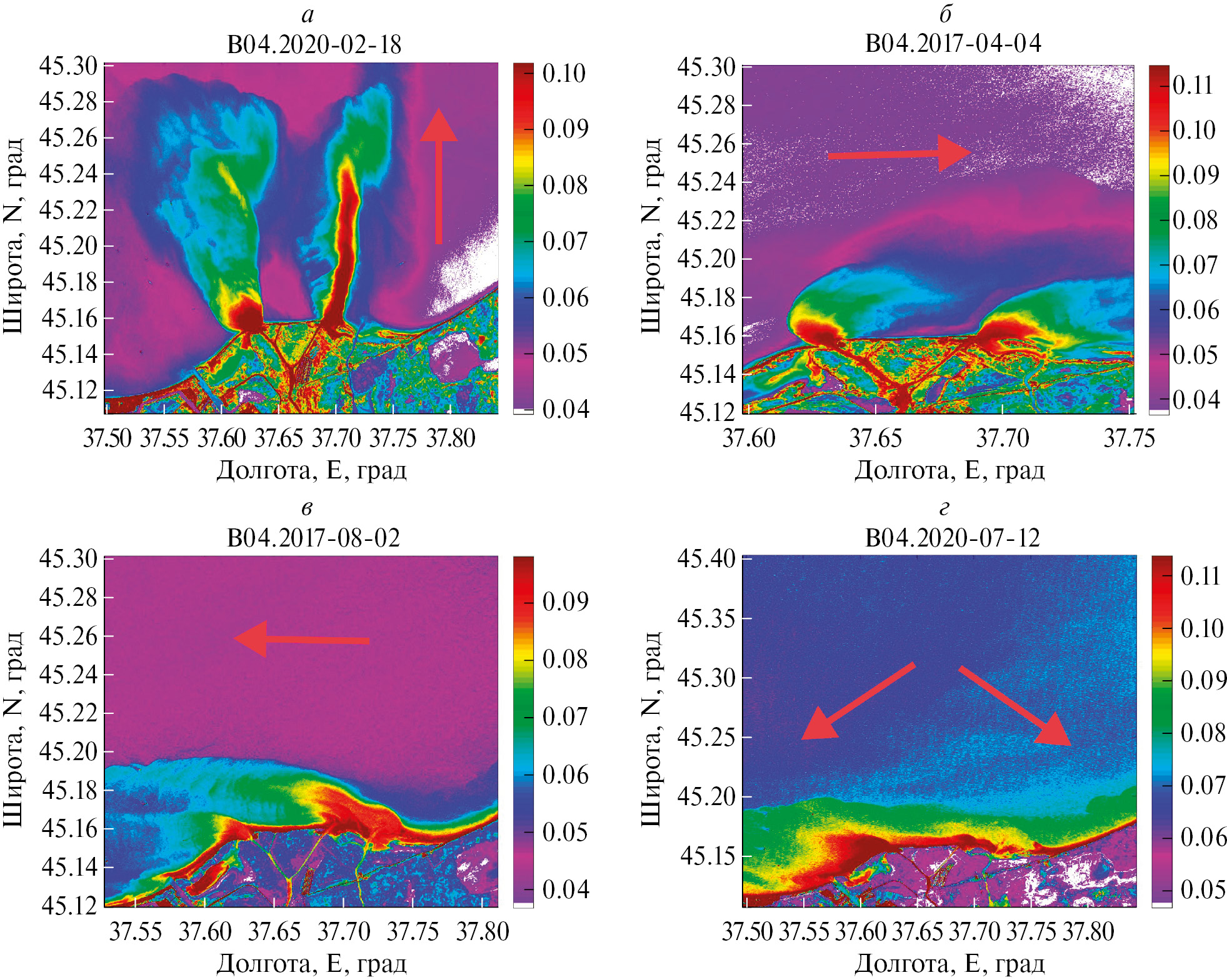 Многолетний анализ спутниковых данных высокого разрешения Landsat 8, 9 и Sentinel-2 позволил выделить четыре условных типа распространения вод Кубани: “северный” (рис. 8, а), “восточный” (рис. 8, б), “западный” (рис. 8, в), “вдольбереговой” (рис. 8, г). Наиболее эффективно конфигурация и направление плюмов идентифицировались на оптических спутниковых изображениях в видимом диапазоне. Анализ гидрометеорологических характеристик показал, что направление распространения плюма зависит в первую очередь от ветровых условий.