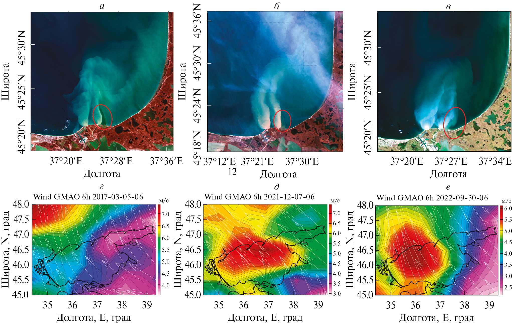 К “северному” типу распространения относились плюмы, которые продвигались на север от устья реки, затем, на некотором расстоянии под влиянием текущей циркуляции вод акватории, поток мутных речных вод мог отклоняться западнее или восточнее. Наиболее интенсивное и обширное проявление плюма до центральной части Азовского моря наблюдается именно при северном типе, т.к. взвешенное вещество преимущественно распространяется в водной среде, в отличие от западного, восточного и вдольберегового направления, когда взвешенное вещество будет частично попадать обратно на берег. В некоторых случаях плюм продвигался на расстояние до 15,5 км от береговой линии. Чаще всего “северный” тип плюмов наблюдается при южном и юго-восточном ветре. Реже такой тип встречается при восточном и юго-западном ветре, что вероятно связано с отклонением потока вправо под влиянием силы Кориолиса. Как правило, наиболее обширное распространение плюма отмечается в условиях низкой ветровой активности (скорость до 5 м/с), что вероятно связано с отсутствием интенсивного перемешивания с окружающими водами. На рис. 9 показаны примеры проявления таких интенсивных плюмов в различные сезоны на спутниковых изображениях Sentinel-2 от 05.03.2017 г. (рис. 9, а), Landsat 8 от 07.12.2021 г. (рис. 9, б), Sentinel-2 от 30.09.2022 г. (рис. 9, в). Во всех представленных примерах на рис. 9 (а, б, в) плюм мутных речных вод распространялся на север и достигал 45°29’ с.ш. при воздействии юго-восточного ветра со скоростью до 5,5 м/с (рис. 9, г, д, е). При этом также фиксируется выход мутных вод из Курчанского лимана через гирло Соловьевское (отмечено красным на рис. 9, а, б, в).