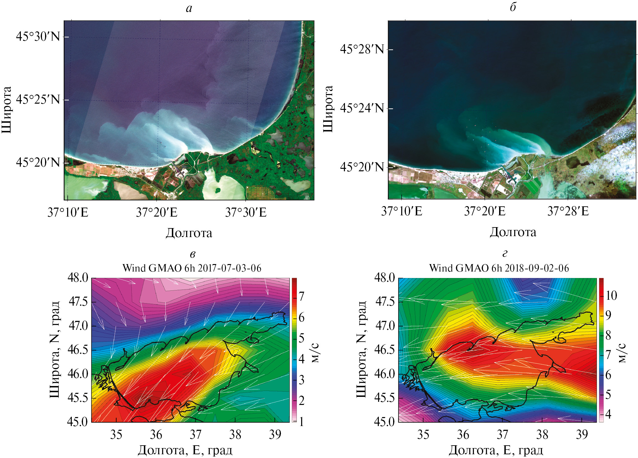 Наиболее часто по спутниковым данным наблюдается смещение плюма Кубань на запад – “западный” тип (35% за 2019–2023 гг.). Пример таких плюмов продемонстрирован на спутниковых изображениях MSI Sentinel-2 от 03.07.2017 г. (рис. 10, а) и OLI Landsat 8 от 02.09.2018 г. (рис. 10, б). В случае от 03.07.2017 г. мутные речные воды продвигаются в западном направлении, в то время как над акваторией наблюдался северо-западный ветер со скоростью до 5–6 м/с (рис. 10, в). Аналогично распространялся плюм зафиксированный 02.09.2018 г. при воздействии западного ветра до 8 м/с (рис. 10, г).