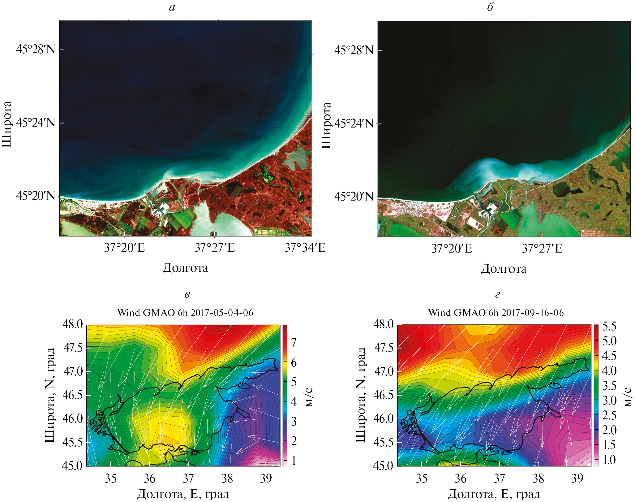 Рис. 12. а – Спутниковое изображение MSI Sentinel-2 от 04.05.2017 г.; б – спутниковое изображение MSI Sentinel-2 от 16.09.2017 г.; в – данные о полях ветра MERRA-2 от 04.05.2017 г.; г – данные о полях ветра MERRA-2 от 16.09.2017 г.