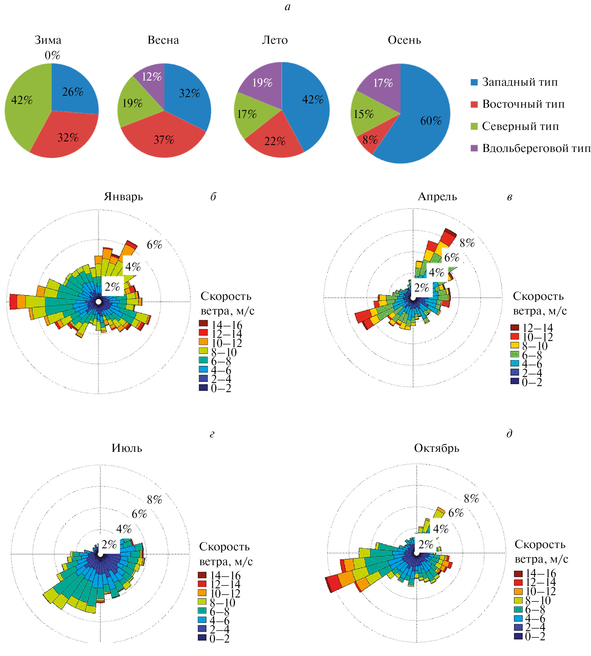 Результаты анализа сезонной изменчивости (рис. 13, а) показали, что в летне-осенние месяцы мутные речные воды чаще продвигались на запад (42% и 60% соответственно), что соответствует преимущественному восточному и северо-восточному направлению ветра в эти сезоны, как показано на примере розы ветров для июля и октября (рис. 13, г, д). Весной большинство наблюдаемых плюмов относилось к “восточному” типу распространения (37%) и несколько реже к “западному” (32%) при воздействии преобладающих юго-западных и немного реже северо-восточных ветров (рис. 13, в). В зимний период 42% зафиксированных плюмов были направлены на север. Следует отметить, что в силу регулярного и обширного облачного покрова над районом исследования, для зим доступно наименьшее количество подходящих оптических спутниковых изображений.