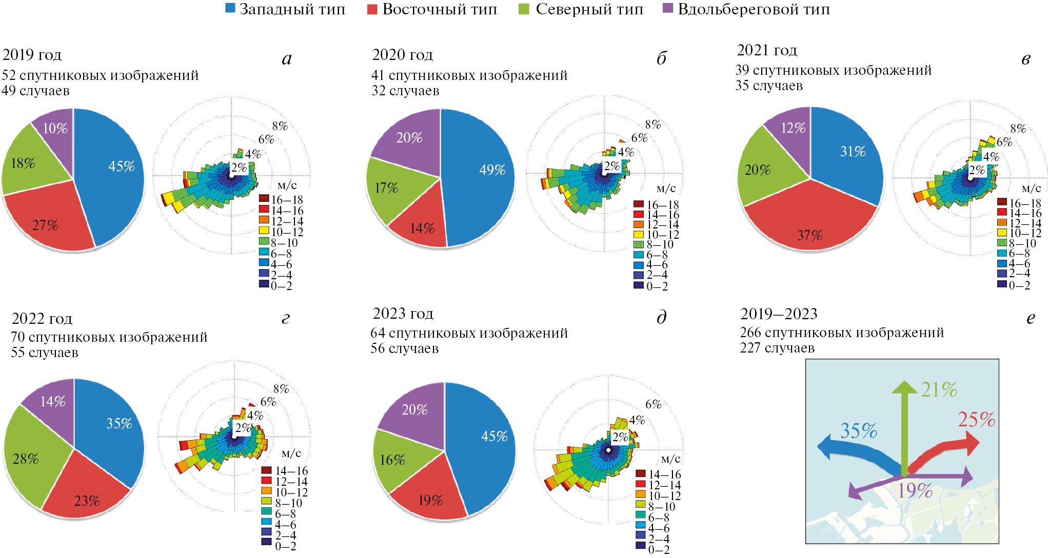 За исследуемый период 2019–2023 гг. в большинстве случаев фиксировались плюмы западного направления (2019 – 45%, 2020 – 49%, 2021 –31%, 2022 – 35% и 2023 – 45% случаев), кроме 2021 года, когда чаще плюмы распространялись на восток, как показано на рис. 14. Всего за исследовательский период “западный” тип распространения наблюдался в 35% случаев, “восточный” тип в 25%, “северный” тип – 21%, “вдольбереговой” – 19% (рис. 14, е).