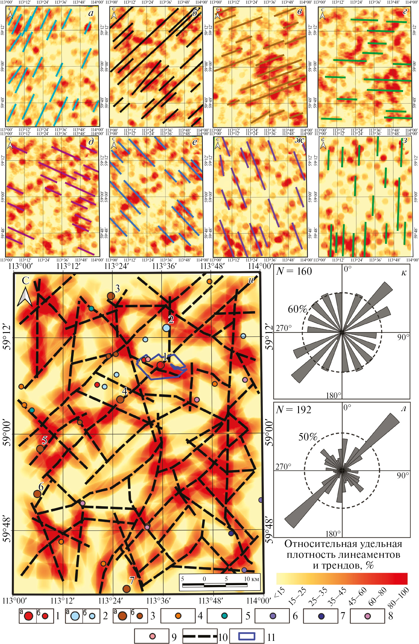 Рис. 7. а–з – схемы относительных удельных плотностей линеаментов по интервалам ориентировок с выявленными трендами (показаны жирными линиями разных цветов) по методике (Сивков и др., 2020): а – 11°-34°; б – 33,5°-56,5°; в – 56°–79°; г – 78,5°–101,5°; д – 101°–124°; е – 123,5°–146,5°; ж – 146°–169°; з – 168,5°–11,5°; и – схема относительной плотности всех выделенных трендов и ее интерпретация с выявлением крупных зон разрывов; к – роза-диаграмма ориентировки трендов линеаментов; л – роза-диаграмма ориентировки выявленных в результате интерпретации трендов линеаментов разломных зон. 1–3 – месторождения (а) и рудопроявления (б): 1 – U, 2 – Sn, 3 – Fe; 4–9– рудопроявления: 4 – Au, 5 – Cu, 6 – Li, 7 – Ta и Nb, 8 – Ti, 9 – W; 10 – выявленные в результате интерпретации трендов линеаментов разломные зоны; 11 – перспективный Туюканский участок. Номерами обозначены месторождения: U – Туюканское (1), Sn – Находка (2), Fe – Чистое (3), Язовское (4), Гремучее (5), Сухое (6), Барчихинское (7). N – количество объектов (трендов и сегментов предполагаемых разломов), использованных для построения розы-диаграммы.