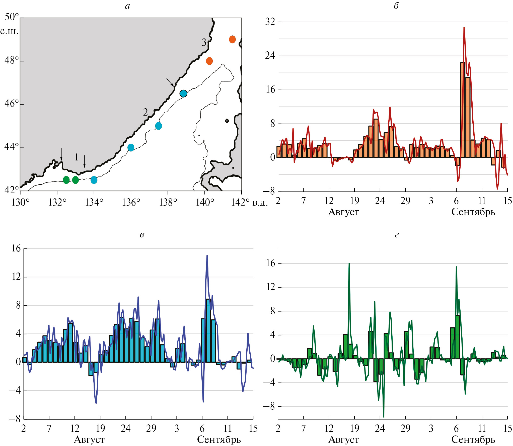 Рис. 2. Положение точек, для которых рассчитывался индекс апвеллинга (а) и результаты расчета ИА для Татарского пролива (б), восточного (в) и южного (г) побережья Приморья. Сплошными тонкими линиями показаны 6-часовые значения ИА, столбики соответствуют среднесуточным значениям индекса. Цвет точек на карте соответствует цвету на графиках. Стрелками (а) обозначены границы районов, для которых рассчитывался средний ИА: 1 – Южное Приморье; 2 – Восточное Приморье; 3 – побережье Татарского пролива.
