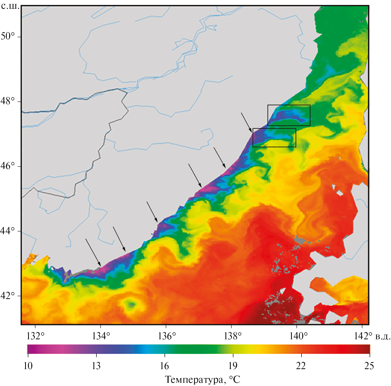 Рис. 3. Распределение поверхностной температуры в северной части Японского моря 28.08.2022 (данные GHRSST и NOAA). Стрелками показано положение ядер апвеллинга, прямоугольники показывают положение поперечных струйных течений, расположенных на 46.5° и 47.5° с.ш.