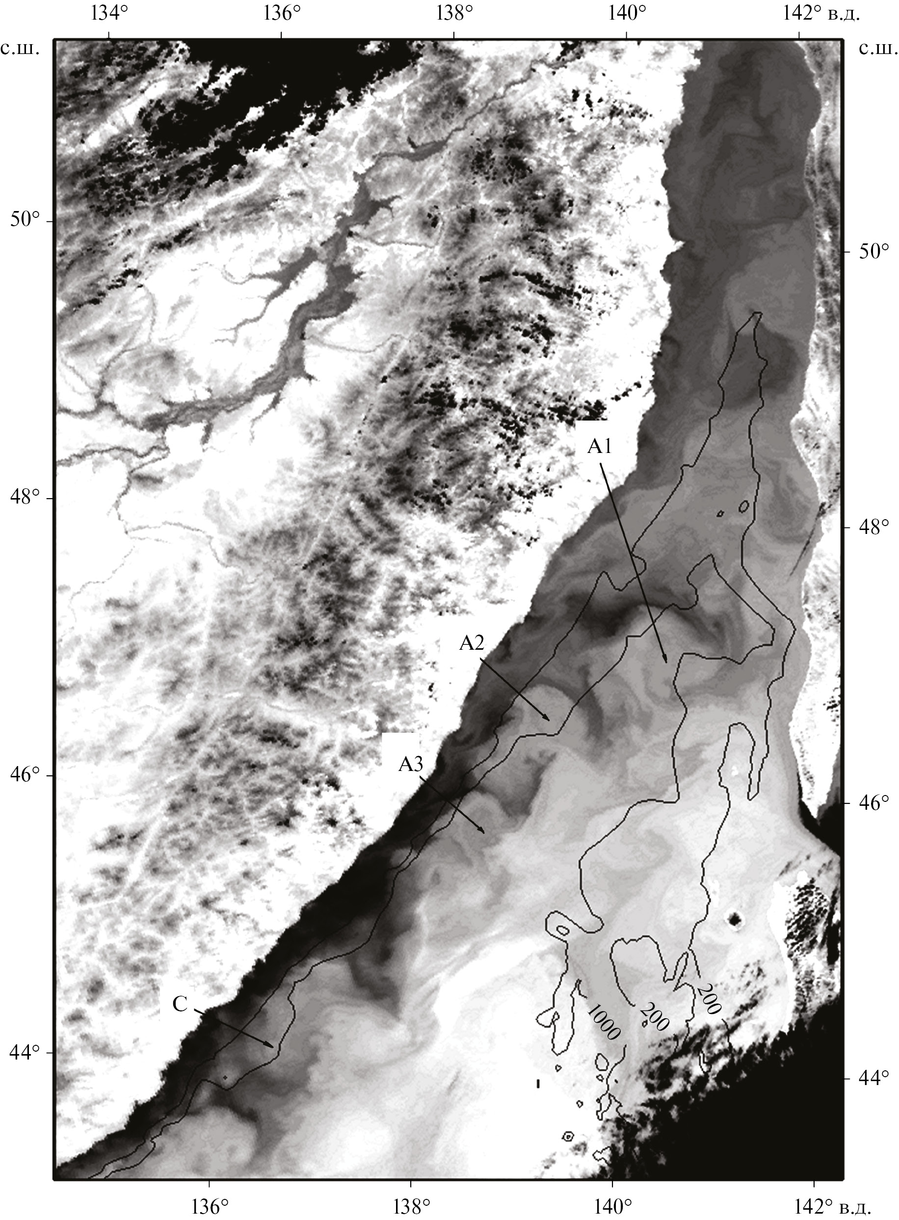 Рис. 4. Спутниковое ИК-изображение (MODIS Aqua) северо-западной части Японского моря, полученное 3.09.2022 в 03:25. Темные тона на снимке соответствуют холодным водам, связанным с апвеллингом, светлые – более теплым водам прилегающих районов моря. Стрелками показаны антициклонические вихри А1, А2 и А3 и циклонический вихрь С. Струйные течения распространяются по периферии этих вихревых структур. Апвеллинговый фронт у Восточного Приморья был связан с кромкой шельфа (изобата 200 м). Мезомасштабные вихри были расположены над материковым склоном. Изобаты построены по данным GEBCO 23.