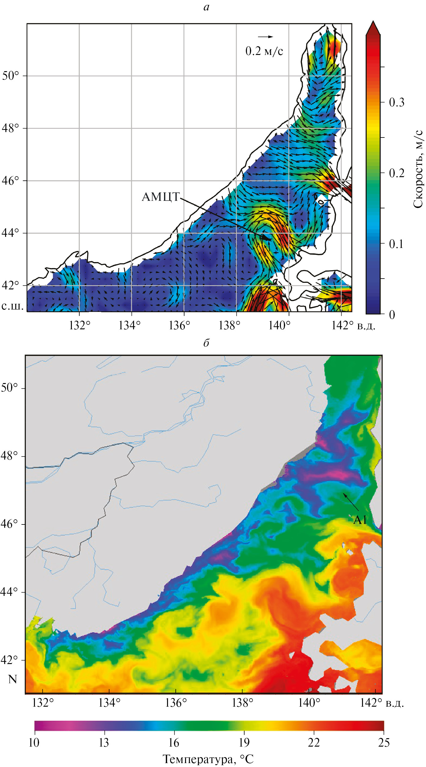Рис. 5. Распределение скоростей суммарных геострофических и ветровых течений в поверхностном слое, полученное 7.09.2022 (а) и распределение поверхностной температуры 8.09.2022 (б) по данным GHRSST и NOAA. Условные обозначения: АМЦТ – антициклонический меандр Цусимского течения, А1 – антициклонический вихрь в районе Татарского пролива.