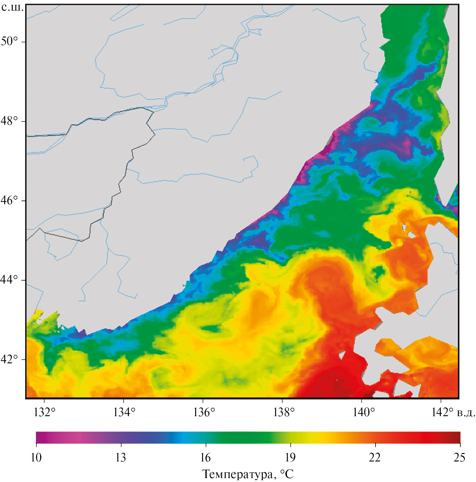 На рис. 3 показано распределение ТПМ в северной части Японского моря, полученное 28 августа. На рисунке видно, что в результате благоприятных ветровых условий у всего северо-западного побережья Японского моря наблюдались холодные воды прибрежного апвеллинга. В пределах этой зоны отчетливо выделялись так называемые ядра апвеллинга с минимальными значениями поверхностной температуры. Такие ядра обычно связаны с районами, в которых меняется ориентация береговой линии и ширина шельфовой зоны. В зоне апвеллинга можно условно выделить 5 ядер апвеллинга, два из которых были расположены на более широких участках шельфовой зоны Приморья (42.75° и 45.20° с.ш.). Минимальные значения температуры в этих ядрах составляли ~11° С, перепад температуры по сравнению с окружающими водами достигал значений 9–10° С.