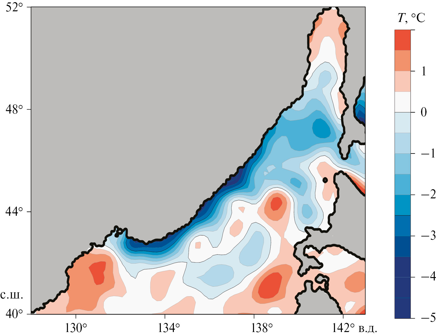 Рис. 7. Пространственное распределение аномалий ТПМ в северной части Японского моря в сентябре 2022 г. относительно средних значений за 1982–2023 гг. (данные NOAA)