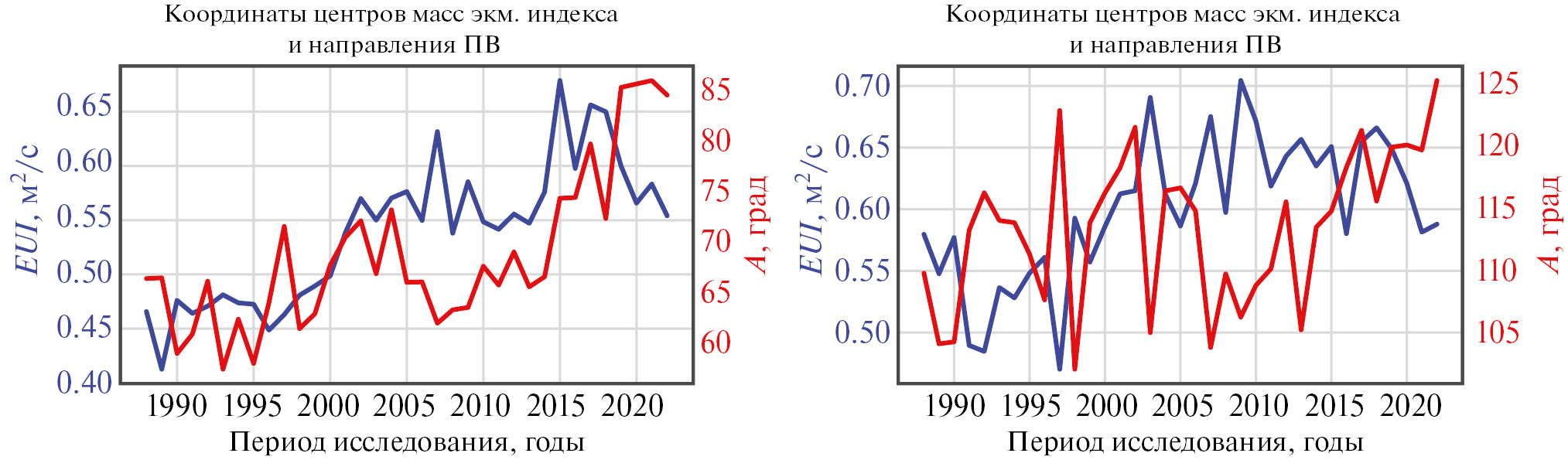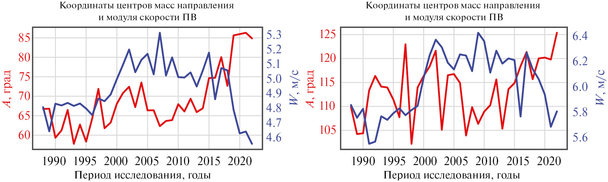 Рис. 6. Межгодовые изменения координат центров масс взаимного распределения направления (красная кривая) и модуля вектора приповерхностного ветра (синяя) за 1988–2022 гг., построенные по ежегодным данным для СЧА (слева) и ЮЧА (справа).