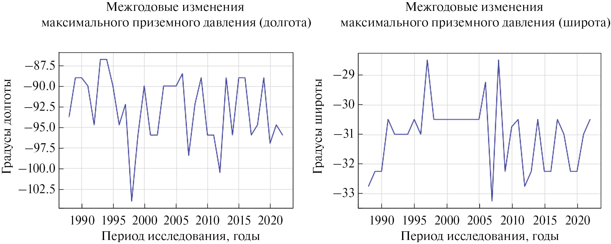 Среднемесячные данные о приземном давлении для юго-восточной части Тихого океана за период с 1988 по 2022 гг. были получены из базы ре-анализа ERA5 (“ERA5 monthly averaged data on single levels from 1940 to present”, Climate Data Store, 2023) и использовались для анализа межгодовой и междекадной изменчивости характеристик субтропического центра высокого давления в юго-восточной части Тихого океана. Пространственное разрешение этих данных по широты и долготе составляет 0.25° × 0.25°.