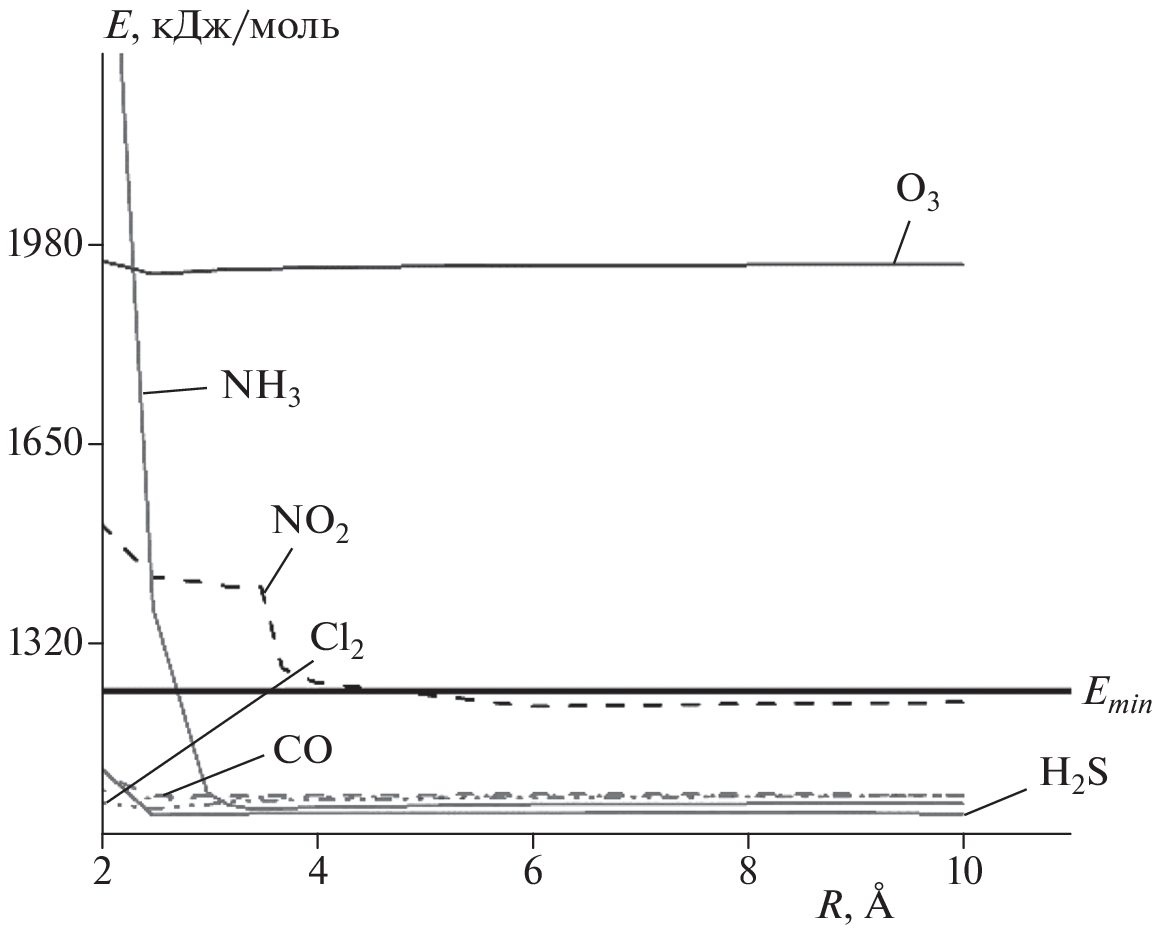 The possibility of the adsorption of priority pollutant gases (nitrogen dioxide, methane, ammonia, sulfur oxide (II), hydrogen sulfide, ozone, carbon monoxide, carbon monoxide (II), chlorine) on the surface of chromium-containing pyrolyzed polyacrylonitrile (pPAN) is evaluated. A model of a cluster of chromium-containing pPAN (Cr-PAN) is constructed. The thermodynamic parameters of the following systems are determined by the method of molecular modeling and compared: Cr-pPAN cluster–gas molecule, Cr-pPAN cluster–oxygen molecule, Cr-pPAN cluster–water molecule, Cr-PAN cluster–oxygen molecule–gas molecule, and Cr–pPAN cluster–water molecule–gas molecule. The effect of a water molecule on the process of adsorption of pollutant gases on the surface of a Cr–PAN cluster and the absence of an effect of an oxygen molecule located in the immediate vicinity of the clusters are revealed. It is established that Cr-pPAN has the property of selective adsorption of the following gases: nitrogen dioxide, chlorine, and ammonia. Within the density functional theory (DFT), the force parameters of the Cr–pPAN structure are estimated and the increase in the contact surface zone upon the introduction of a Cr2O3 molecule is confirmed.