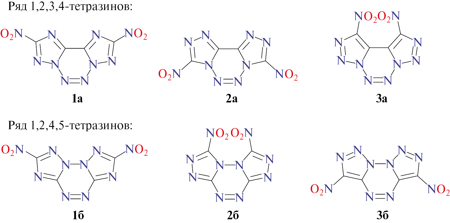 Первым из указанных производных был синтезирован 2,9-динитробис([1, 2, 4]триазоло)[1,5-d : 5′,1′-f ][1, 2, 3, 4]тетразин (1а), структура которого содержит 1,2,3,4-тетразин с двумя аннелированными с ним нитро-1,2,4-триазолами [18]. Предварительная оценка свойств этого соединения показала, что, наряду со сравнительно высокой плотностью, по детонационным характеристикам оно находится на уровне самого мощного ВЭМ — октогена, но при этом обладает заметно меньшей чувствительностью, чем октоген и гексоген. Приведенные достоинства соединения 1а делают привлекательным для поиска новых ВЭМ ряд энергоемких 5/6/5-трициклических производных 1,2,3,4-тетразинов, аннелированных триазолами. Кроме этого, поскольку недостатком соединения 1а является сравнительно невысокая термостабильность, то, наряду с 5/6/5-трициклическими производными несимметричного 1,2,3,4-тетразина, внимания заслуживают и потенциально более термически устойчивые изомерные аналоги на основе симметричного 1,2,4,5-тетразина, первые представители которых были недавно синтезированы [21].