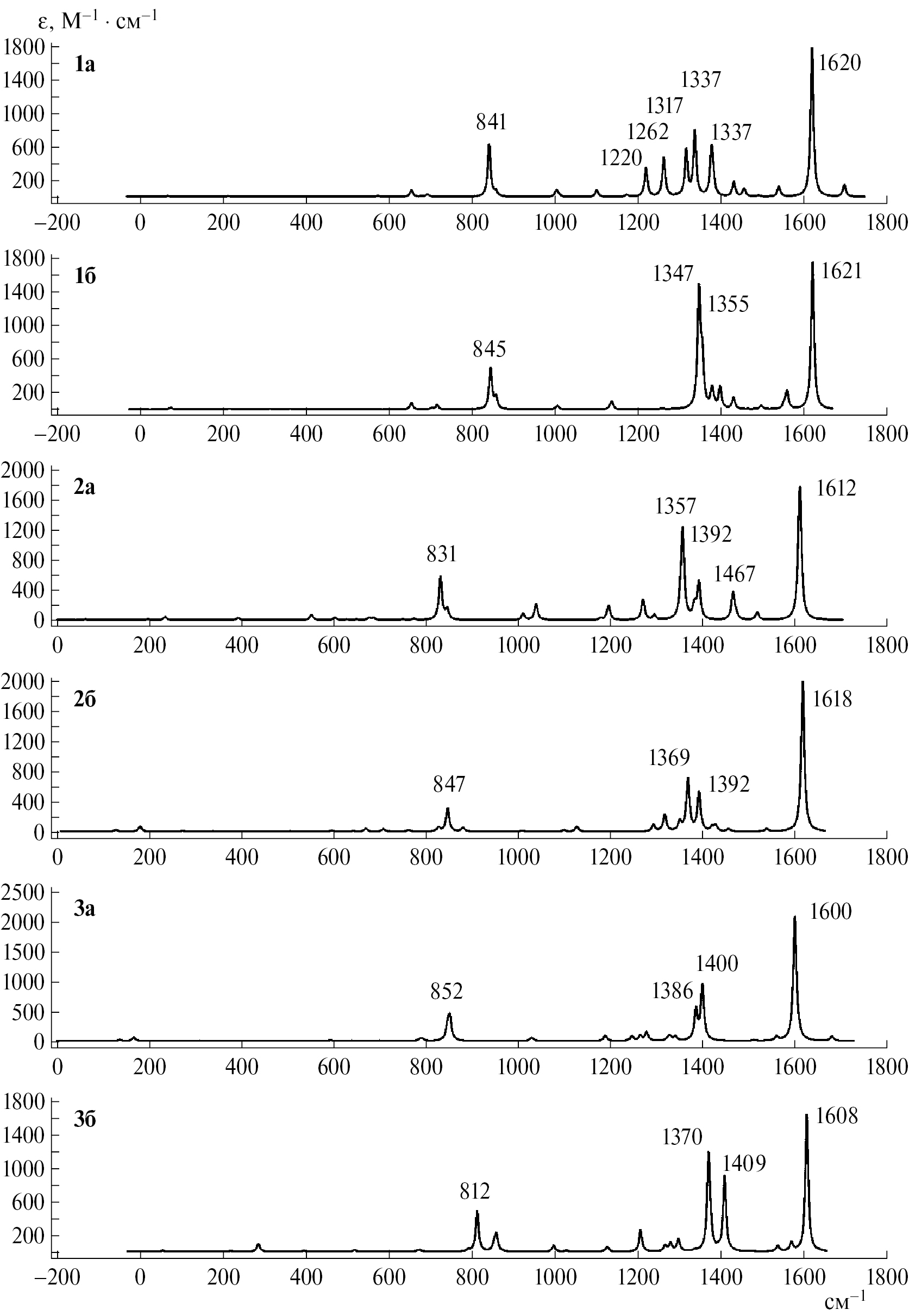Рис. 4. ИК-спектры (e — коэффициент молярной экстинции) поглощения изомерных структур 1а,б–3а,б.