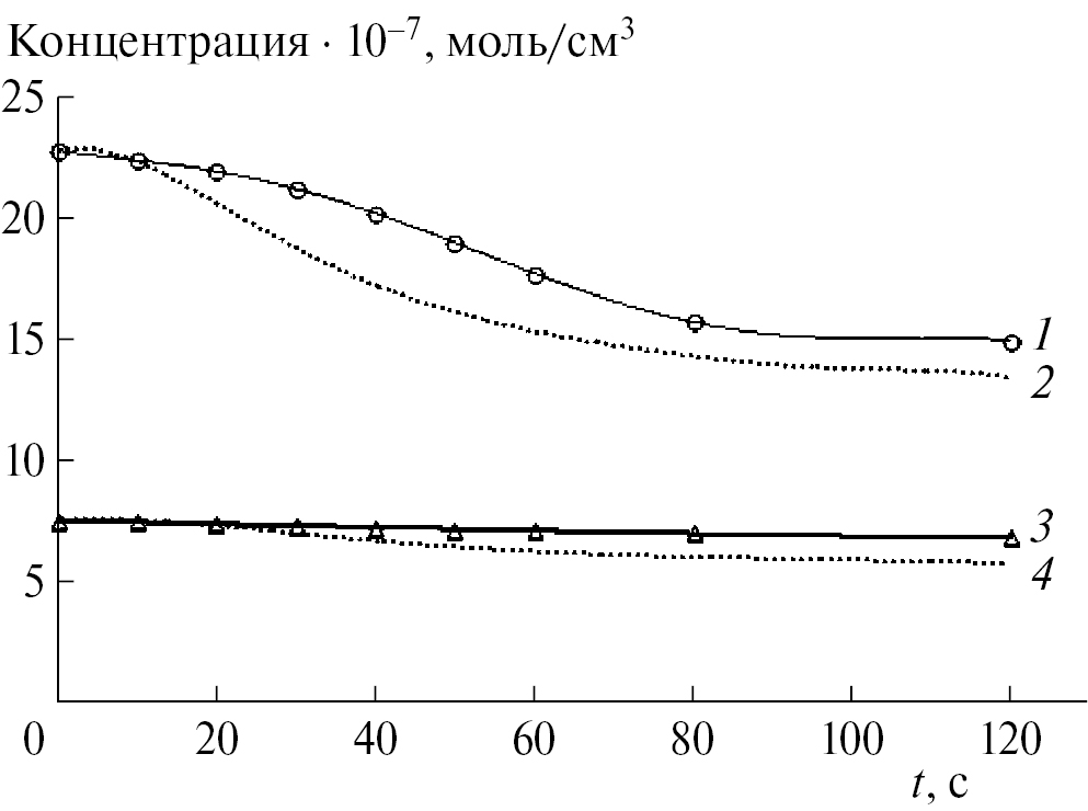 Рис. 1. Кинетические кривые расхода пропана (1, 2) и пропилена (3, 4), полученные экспериментально (1, 3) и при моделировании (2, 4). Смесь C3H8 : O2 : (Ar + + C3H6) состава 1 : 1 : (0.67 + 0.33), T = 360 °C, P = 270 Торр.