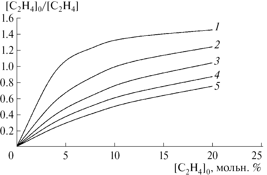 Примечание: расчет проведен при [C2H4]0 = 0, 5, 10, 15 и 25 мольн. %.