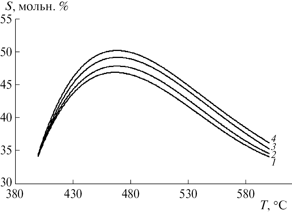 Рис. 5. Расчетная зависимость селективности образования пропилена КС3Н8 от температуры для различных концентраций этилена в смеси C3H8 : O2 : (C2H4 + N2) состава 10 : 5 : 5 при P = 1 атм: 1 — [C2H4]0 = 0, 2 — 5, 3 – 15, 4 — 25 мольн. %.