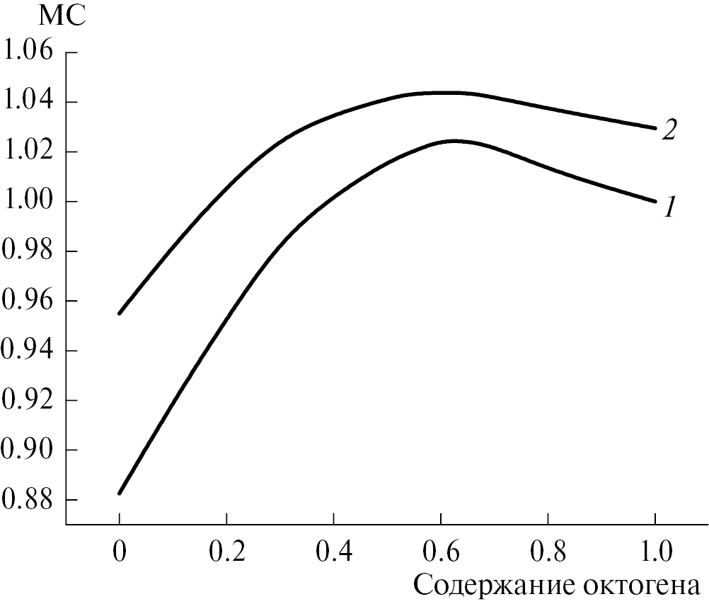 Рис. 2. Зависимость МС взрывчатых составов от содержания октогена. 1 — состав октоген — соединение VI, 2 — состав октоген — соединение VI — алюминий.