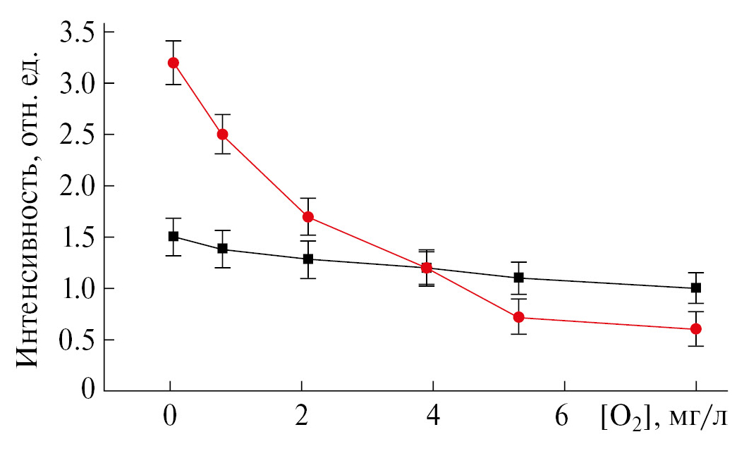 Рис. 2. Зависимость интегральной интенсивности триплетного сигнала малой интенсивности, связанного с кластерами БСА, от содержания кислорода в растворе по данным ЭПР-спектроскопии: кружки — облученный образец, квадраты — необлученный.