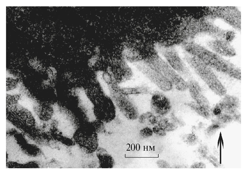 Рис. 3. Срез поверхности клетки МСДК, зараженной вирусом гриппа A/California/07/09, после обработки водным раствором H5PMo10V2O40 (25 мкМ). Стрелкой отмечена группа дефектных ВЧ (без нуклеоида).
