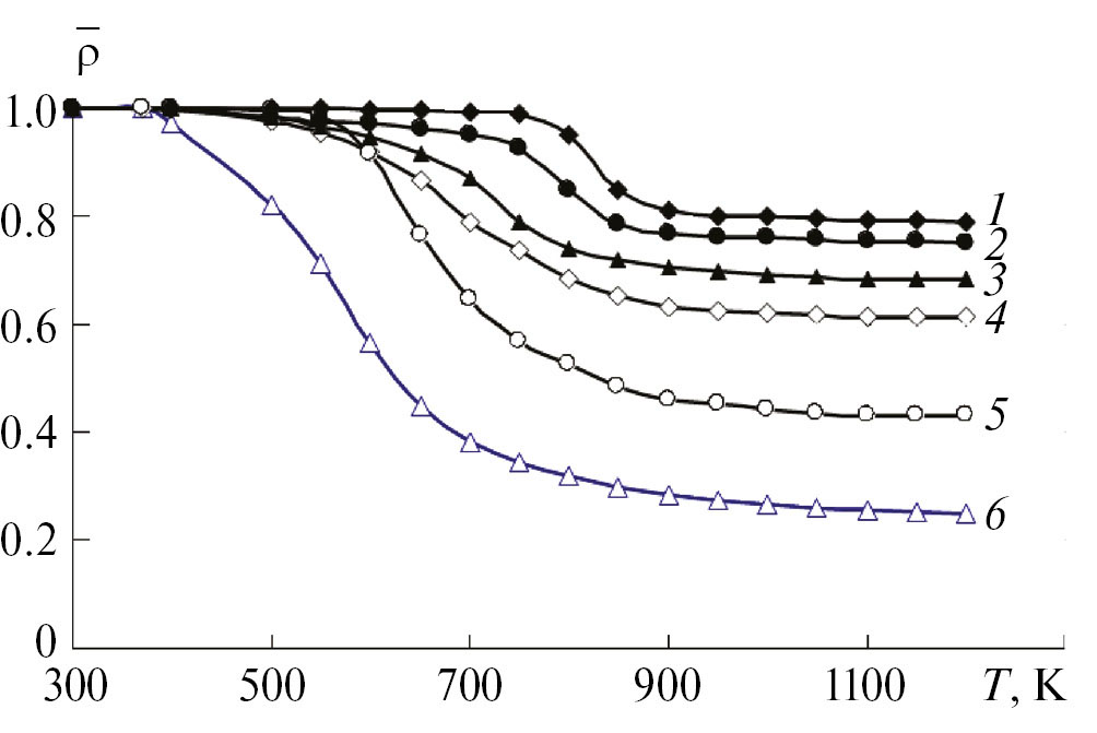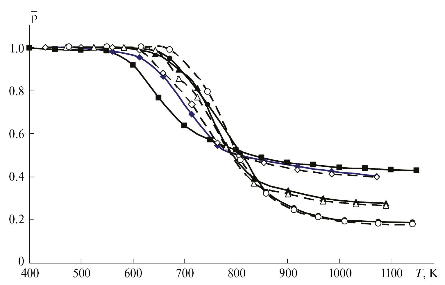На рис. 5 приведены расчетные кривые изменения относительной плотности образцов для обоих режимов. Из рисунка видно, что в конце нагрева при одной и той же температуре величина твердого остатка существенно различается. Темным кружком показан остаток, полученный в эксперименте при нагреве по первому режиму. Близость экспериментального результата к расчетной кривой по первому режиму подтверждает правомерность принятой модели термической деструкции.