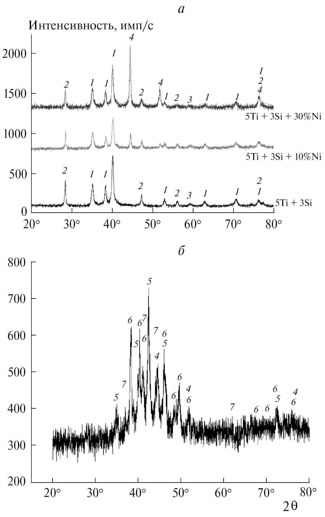 Рис. 1. Результаты рентгенофазового анализа: а – активированных смесей 5Ti + 3Si + xNi (x = 0, 10, 30 мас. %); б – продуктов механосинтеза смеси 5Ti + 3Si + + 40%Ni. Цифрами обозначены рефлексы фаз: 1 – Ti, 2 – Si, 3 – TiH1.5, 4 – Ni, 5 – Ni3Ti3O, 6 – TiNiSi, 7 – Ti5Si3.