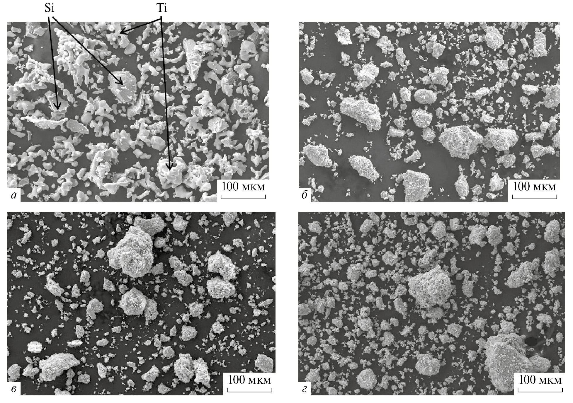 Исходная порошковая смесь состоит из крупных частиц кремния осколочной формы и частиц титана, имеющих дендридную форму (рис. 2а). В процессе активации смеси 5Ti + 3Si исходные частицы деформируются, разрушаются и агломерируются. В результате частицы титана приобретают форму, близкую к сферической. Разрушение исходных частиц приводит к образованию множества мелких частиц – обломков (рис. 2б).