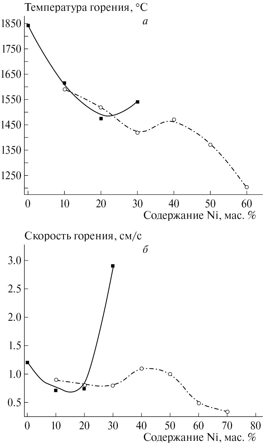 Рис. 4. Экспериментально измеренные зависимости максимальной температуры (а), скорости горения (б) от процентного содержания никеля в исходной (, штрих-пунктирная линия) и активированной (■, сплошная линия) смесях 5Ti + 3Si + xNi.