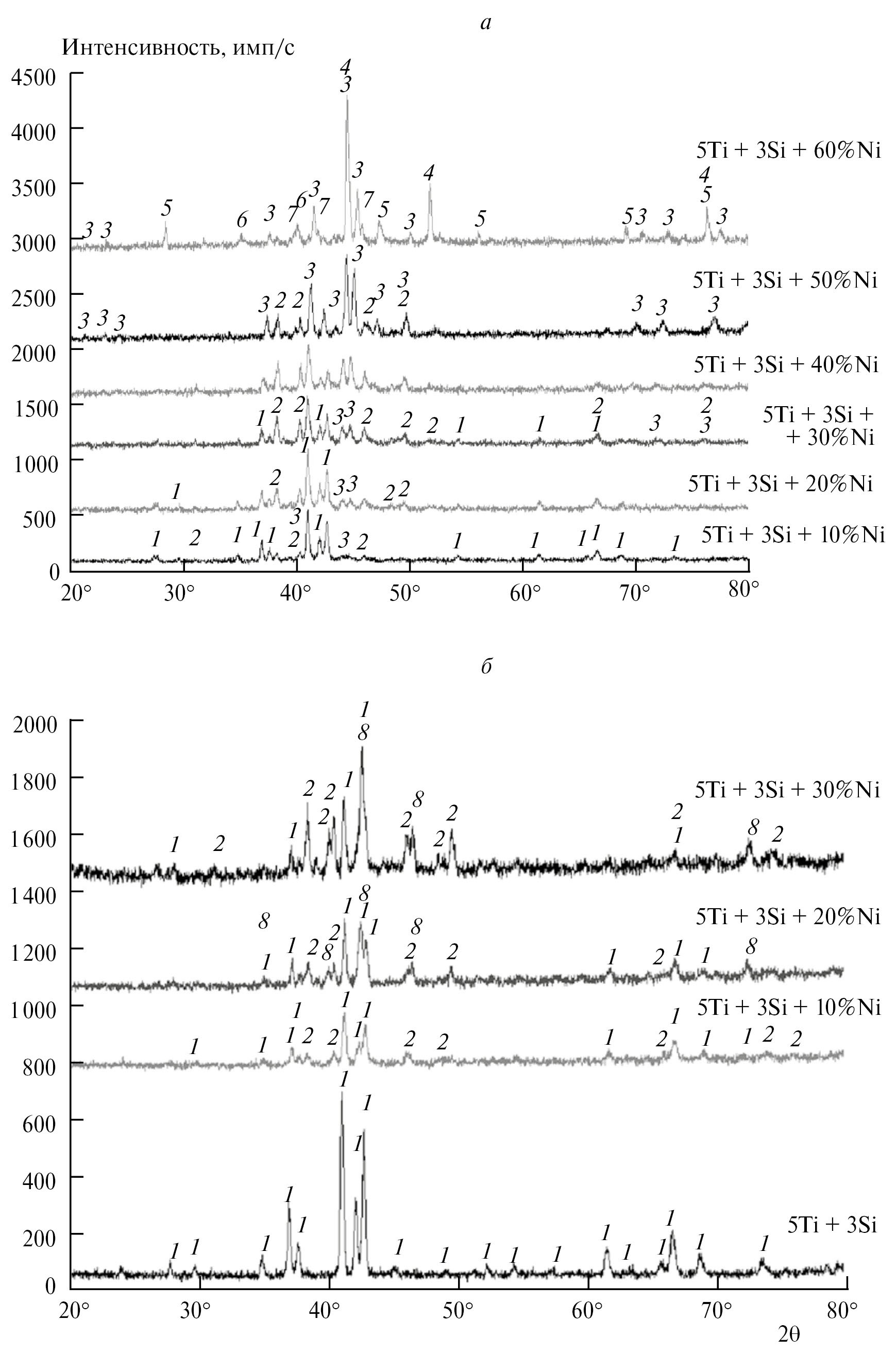 Рис. 5. Результаты рентгенофазового анализа продуктов синтеза исходной (а) и активированной (б) смесей 5Ti + 3Si + + xNi с различным содержанием никеля. Цифрами обозначены рефлексы фаз: 1 – Ti5Si3, 2 – TiNiSi , 3 –Ti2Ni3Si, 4 – Ni, 5 – Si, 6 – Ti, 7 – Ni16Ti6Si7, 8 – Ni3Ti3O.