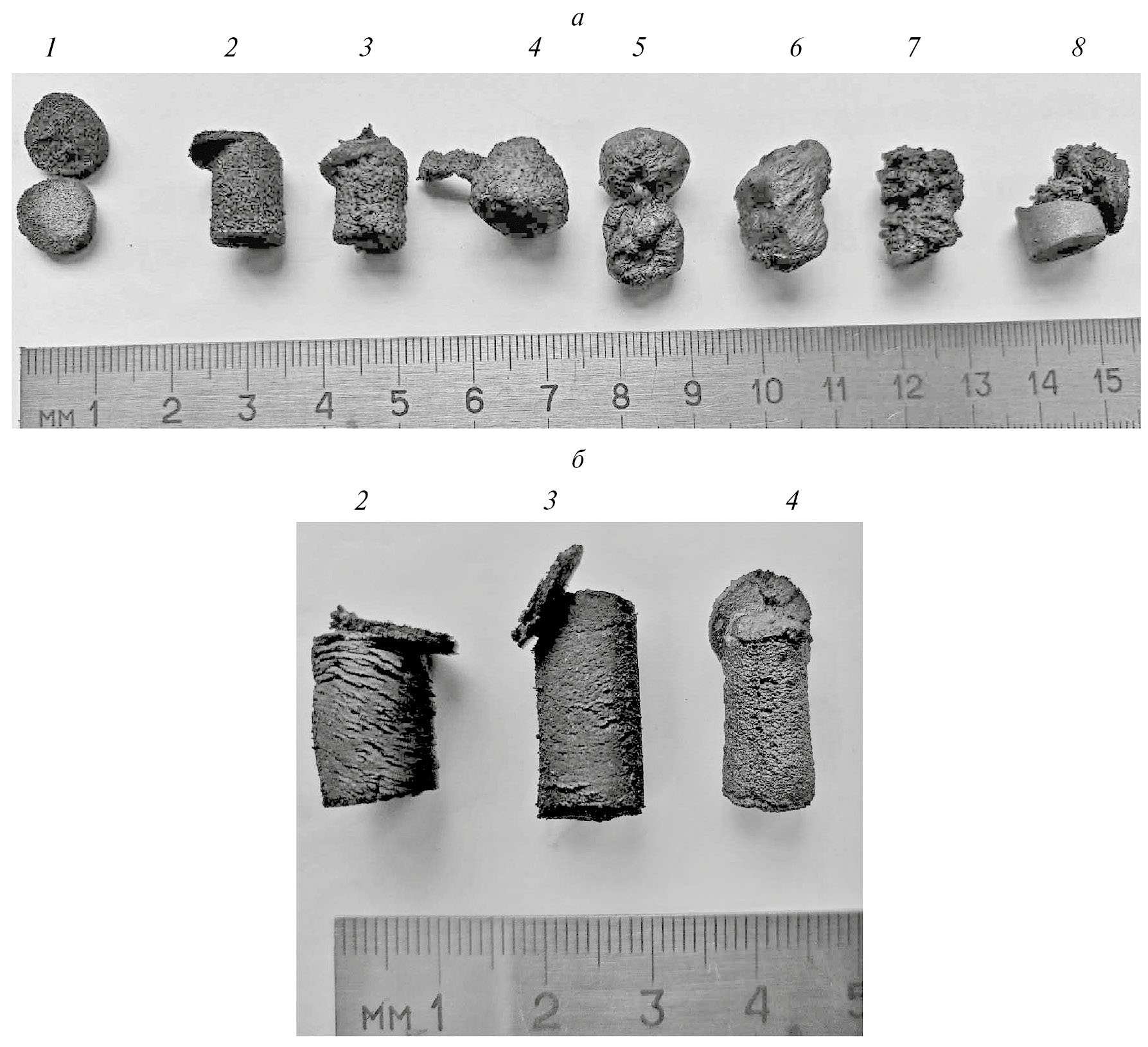 Рис. 6. Фотография образцов продуктов горения исходной (а) и активированной (б) смесей 5Ti + 3Si + xNi с различным содержанием никеля: 1 – 0, 2 – 10, 3 – 20, 4 – 30, 5 – 40, 6 – 50, 7 – 60, 8 – 70 мас. %.