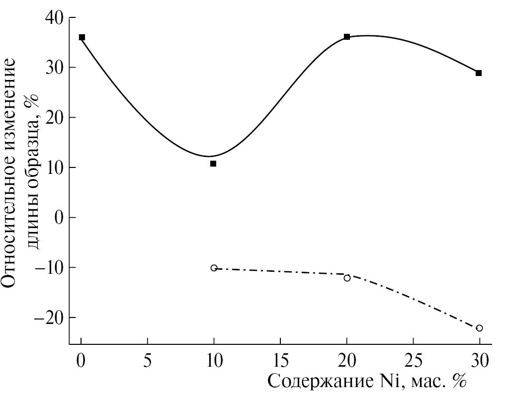 Этот факт подтверждается также зависимостью изменения длины образцов продуктов исходных смесей 5Ti + 3Si + xNi от содержания никеля (рис. 7). Данная зависимость построена при тех значениях содержаниях никеля, когда при изменении формы образцов продуктов горения можно было измерить изменение длины. Видно, что с увеличением содержания никеля в исходных смесях 5Ti + 3Si + xNi возрастает усадка образцов продуктов синтеза.